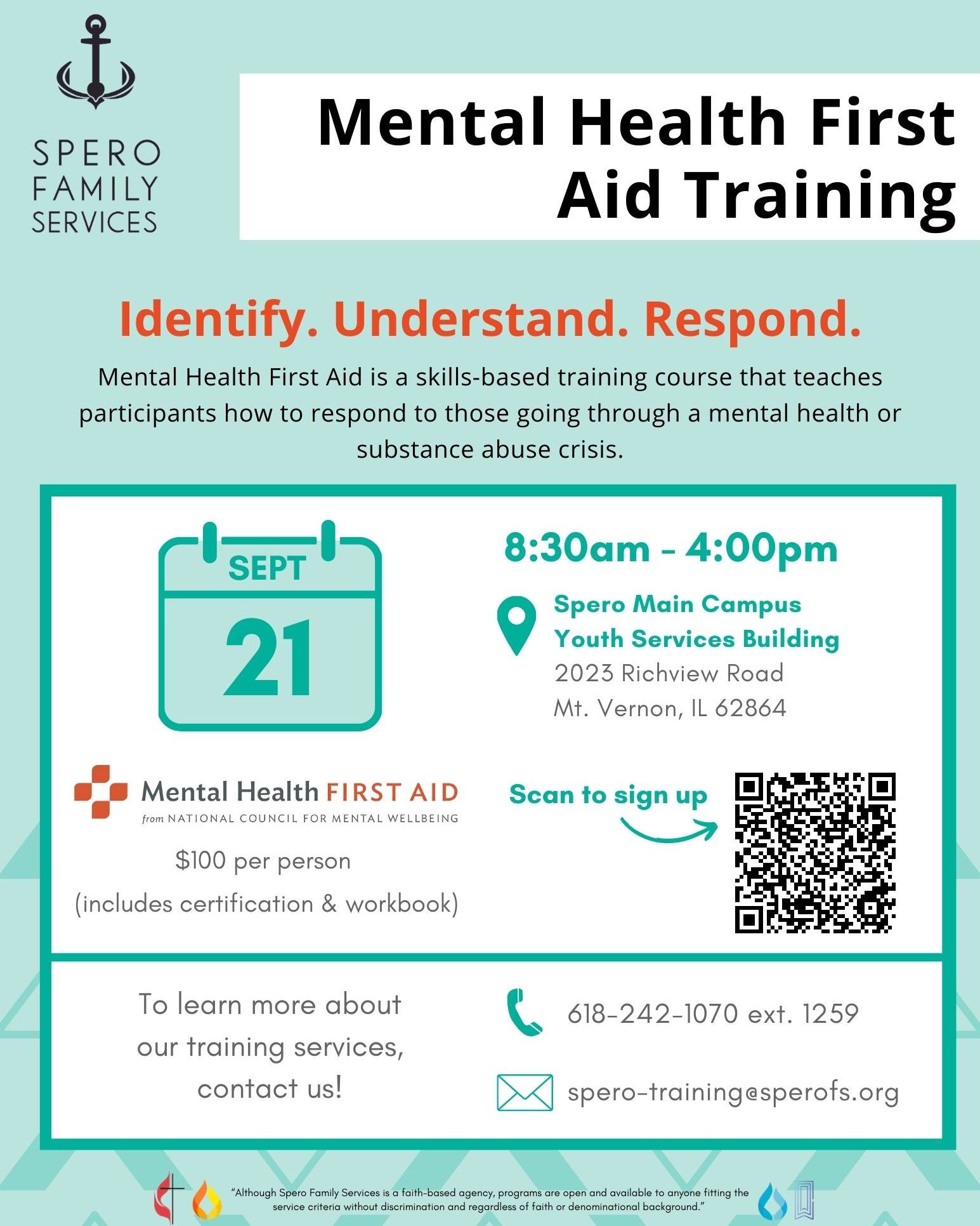 Take fear and hesitation out of starting conversations about mental health and substance abuse! Spero Professional Development is now offering Adult Mental Health First Aid training. Mental Health First Aid is a national certification program providing skills-based training to identify the signs and symptoms of mental health or substance use challenges that many people from different walks of life would benefit from.